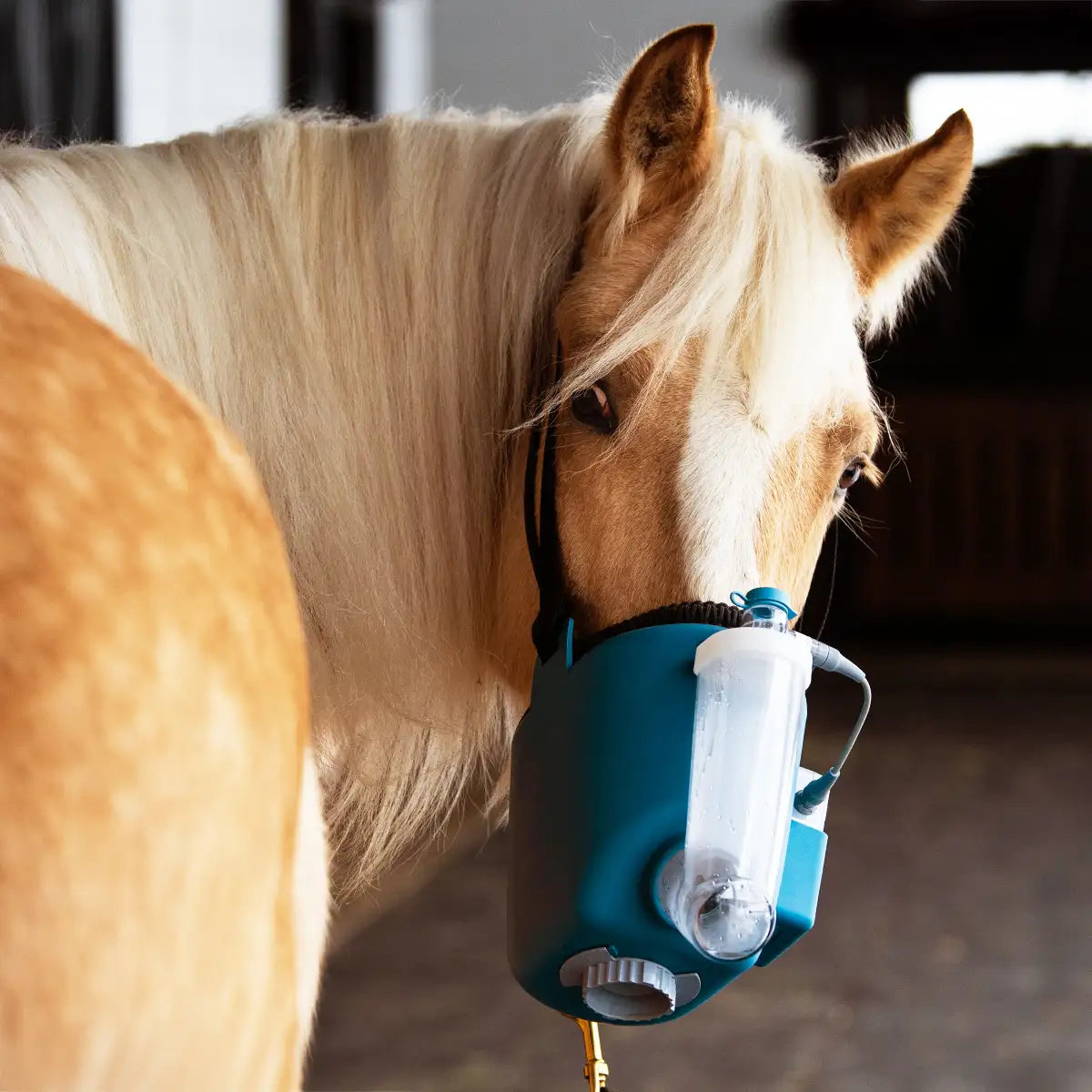Liquids which are intended to act in the lungs are put into the Flexineb E3 cup and are converted into a fine mist to be inhaled by the horse.