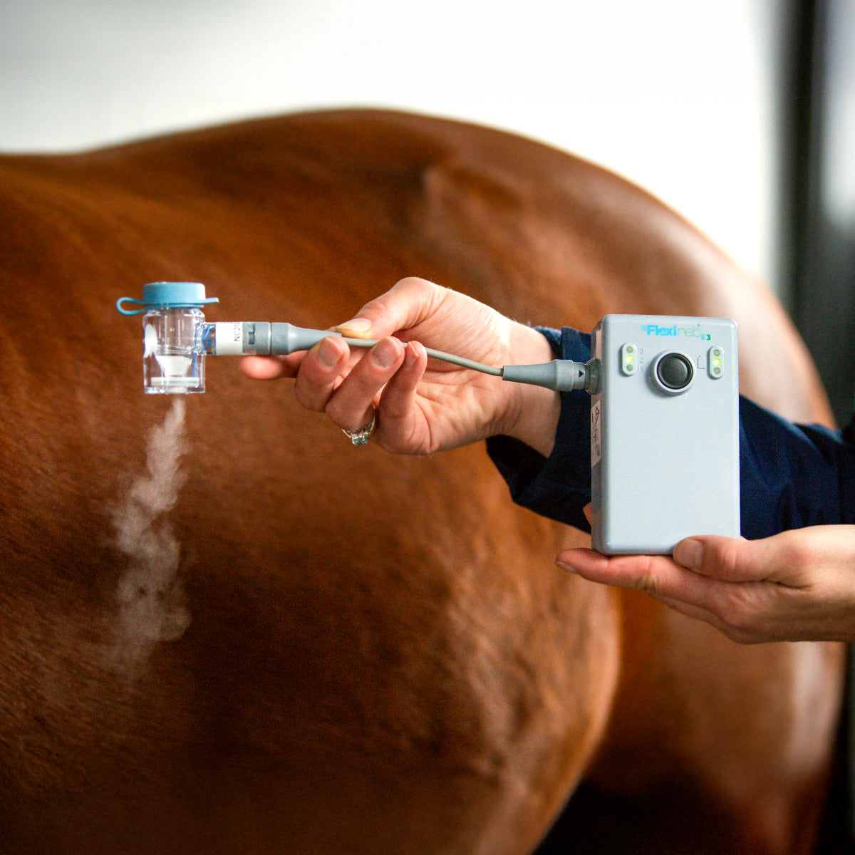 The Flexineb E3 converts liquid solutions which are intended to act in the lungs into a fine mist to be inhaled by the horse.